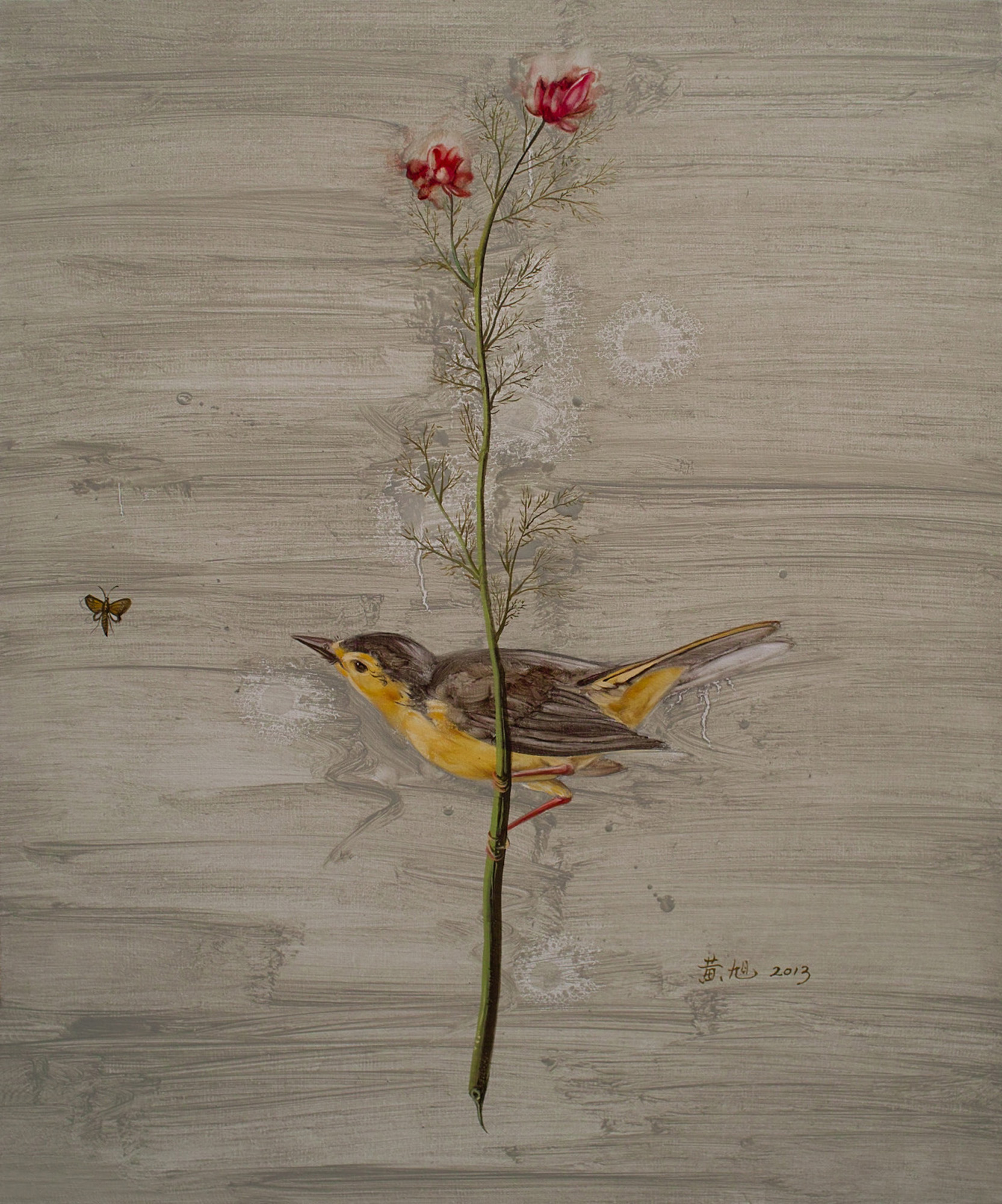 他自幼跟随爷爷和父亲学习国画和油画,是名副其实的艺三代,也是我的前辈。他为人低调谦逊,有一种特殊的儒雅与宽厚的气质。近十年来,黄旭常以花鸟为题材创作油画,并从中找到了自己的方向。他在对传统油画和新的材质及当代艺术进行探索和反思的同时与中国传统绘画进行对照,从觉悟和内化中对花鸟画进行重新理解和解读。他直面生活现实和日常的细节,在反复探索实践和自我反省中明心见性,作品不断生发出新的内涵,并形成了个人独到的艺术风貌。