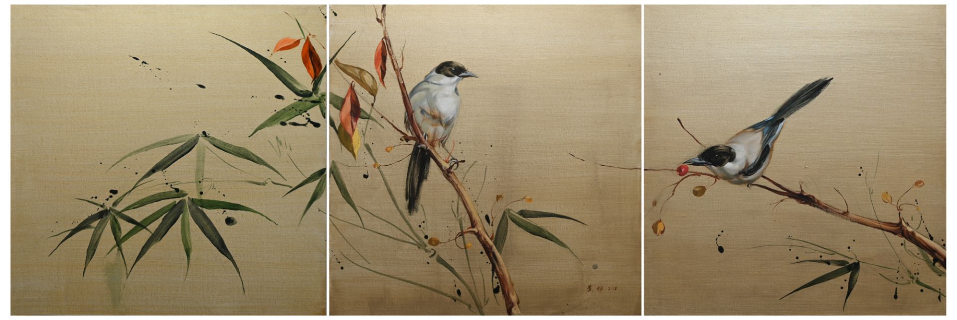 王阳明曾说“心外无物”,也就是说一切事物不能脱离心而存在,心也不能离开事物而存在。黄旭的花鸟油画中,画面中鸟儿不同的生命状态也是他自己生命体验的折射。有他对现实的不满,也有对生命无常的坦然。从2013年作品中表现的鸟儿的挣扎,再到近些年作品中鸟儿的自由、惬意、无拘无束的超然,能看出他心境的变化。其实对自由和自我的理解我们心理都是想通的,黄旭的作品既表达了自己的感受,又说出了他人的心声。在我看来,美学修养很高的人才能创作出这些作品,这依靠的绝不仅是艺术的表现形式,而是创作者内在的精神和气场。任何一幅好的作品都是精神的产物,心境决定意境,意境体现创作者的处世态度和精神思想。